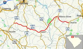 SC 211 begins at an intersection with SC 150, north of Pacolet in Cherokee County, going easterly along Asbury Road to Asbury, where it connects with SC 18. Splitting from SC 18 onto Gowdeysville Road, it connects with SC 105 in Saratt. Solo again, when it splits from SC 105 with Hickory Grove Road, it crosses the Broad River and into York County. At Hickory Grove, it connects briefly with SC 97, before continuing southeasterly to Sharon, where it ends at an intersection with SC 49.[3]