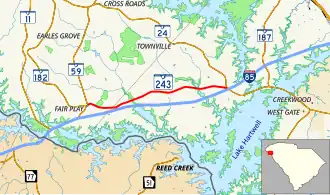 South Carolina Highway 243 (SC 243) is a 8.380-mile-long (13.486 km) state highway in the U.S. state of South Carolina. The highway travels on an east–west direction (though signed as north–south) from SC 59 and SC 182 in Fair Play to Interstate 85 (I-85) exit 11 and SC 24. The highway closely parallels I-85 to the north.