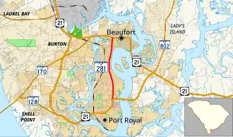 South Carolina Highway 281 (SC 281) is a 3.190-mile (5.134 km) state highway located entirely within Beaufort County, in the southern part of the U.S. state of South Carolina. Known locally as Ribaut Road (pronounced REE-bo), SC 281 serves as an arterial connecting Beaufort and Port Royal.