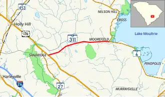 South Carolina Highway 311 (SC 311) is a 9.250-mile-long (14.886 km) state highway in the southeastern part of the U.S. state of South Carolina. The highway travels in a west-to-east orientation from Sandridge, which is approximately six miles (9.7 km) southeast of Holly Hill, to a point approximately four miles (6.4 km) south of Cross.