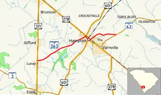 South Carolina Highway 363 (SC 363) is a 13.270-mile-long (21.356 km) state highway in the U.S. state of South Carolina. The highway is designated on an east–west direction, from U.S. Route 321 (US 321) in Luray to SC 63 just outside Varnville.