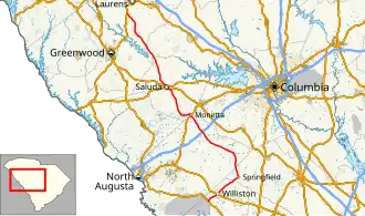 SC 39 is a two-lane rural highway that travels 100.7 miles (162.1 km) from the Savannah River Site to U.S. Route 221 (US 221) south of Laurens.[7]