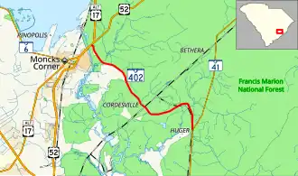 SC 402 is a two-lane rural road that begins at U.S. Route 52 (US 52) and U.S. Route 17 Alternate (US 17 Alt.) near Moncks Corner; per the South Carolina Department of Transportation, SC 402 ends at the pair of U.S. Highways though signage on US 52/US 17 Alt direct travelers "to" SC 402.[1][2] From there, it goes east, through Cordesville and by the Huger Recreational Area. At Huger, it ends at SC 41. Because it traverses mostly in or along Francis Marion National Forest, majority of the route is forested.[2]
