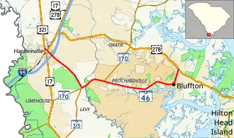 South Carolina Highway 46 (SC 46) is a 17.330-mile-long (27.890 km) state highway in Jasper and Beaufort counties in the Lowcountry region of South Carolina. It connects the rapidly growing communities of Hardeeville and Bluffton and serves as a parallel route to U.S. Route 278 (US 278).