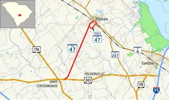 South Carolina Highway 47 (SC 47) is a 5.740-mile (9.238 km) primary state highway in the U.S. state of South Carolina. It serves to connect the town of Elloree with U.S. Route 301 (US 301).