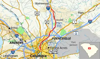 SC 555 traverses 14.67 miles (23.61 km) from SC 12 in downtown Columbia to U.S. Route 21 (US 21) near Blythewood. Before Interstate 77 (I-77) was completed in the area, SC 555 served as a major thoroughfare; today it is an alternate route. The highway is four lanes south of I-77 and two lanes north of it.[2]