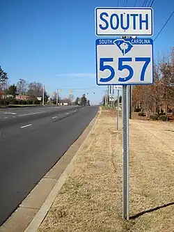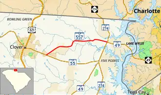 SC 557 is a two-lane rural highway that traverses 6.7 miles (10.8 km) from SC 55 near Clover to SC 49/SC 274 in Lake Wylie. The highway provides travelers a more direct route to and from Charlotte. Though it runs physically west-to-east, it is signed as a north-south highway with its western end as its southern terminus and vice versa.[2]