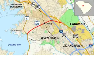 SC 60 is a mostly four-lane with median suburban highway that travels 5.16 miles (8.30 km) from SC 6 to U.S. Route 176 (US 176), with an interchange with Interstate 26 (I-26)/US 76.[3]