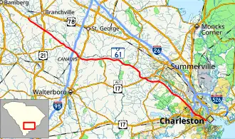 South Carolina Highway 61 (SC 61) is a 67-mile-long (108 km) state highway in the U.S. state of South Carolina. The highway is designated on a north–south direction, but physically travels in an east–west direction, from SC 30 in Charleston to U.S. Route 78 (US 78) near Branchville. The portion of SC 61 from Church Creek Bridge and 10 miles (16 km) north is designated a National Scenic Byway.[2]