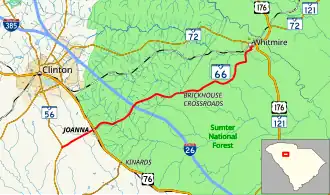 SC 66 is a two-lane rural highway that travels 17.6 miles (28.3 km) from SC 56 to SC 72 in Whitmire. It connects to U.S. Route 76 (US 76) and Interstate 26 (I-26). Predominantly in the Sumter National Forest, it meanders through forest lands; in Whitmire, it takes a couple of turns before reaching SC 72 via Central Avenue, Park Street and Glenn Street.[3]