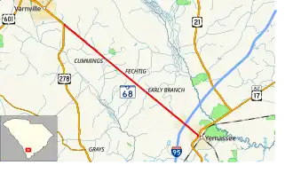 The route of SC 68 travels generally in a northwest to southeast direction, beginning at a junction with U.S. Highway 278 (US 278 just south of Varnville. The highway travels in a nearly straight line for its entire length, paralleling the Port Royal and Augusta Railway (today the CSX Augusta Subdivision). The roadway passes through the small hamlet of Early Branch before widening to a four-lane configuration about one mile (1.6 km) north of the I-95 junction. Passing underneath I-95, SC 68 returns to a two-lane configuration as it enters Yemassee before terminating at an intersection with US 17 Alternate and US 21.[2]