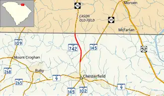 South Carolina Highway 742 (SC 742) is a 3.510-mile (5.649 km) primary state highway in the U.S. state of South Carolina. It connects Chesterfield with Wadesboro, North Carolina.