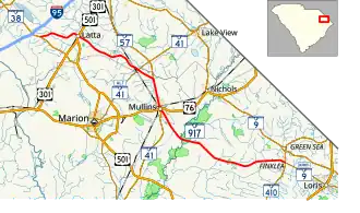 The highway travels in a southeast-to-northwest direction, but is signed as a north–south highway. It travels between SC 410/SC 9 Bus. in the community of Finklea, through Mullins where it has a concurrency with SC 41 and intersects US 76, Latta where it intersects U.S. Route 301 (US 301) and US 501, to SC 38 south of its interchange with I-95.[4]