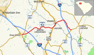 South Carolina Highway 92 (SC 92) is a 16.46-mile-long (26.49 km) state highway in the U.S. state of South Carolina. The highway connects Gray Court with the Enoree area.