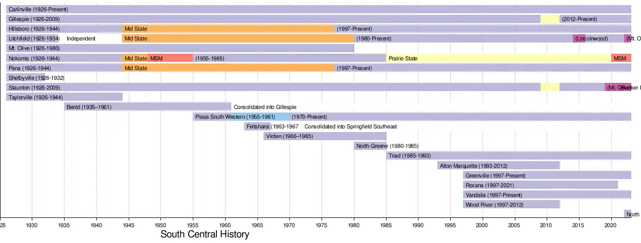 A wave of change occurred in 1944 as Hillsboro, Nokomis, Pana and Taylorville would all leave the South Central for the newly formed Mid State Conference. This exodus resulted in a 5 team football conference that would not change until 1955. Prior to the 1955 school year, Nokomis would rejoin the league as well as Piasa South Western. South Western would only remain in the conference for 6 years, leaving in 1961. That same year, Benld High School was consolidated into Gillespie High School, reducing the number of schools back down to only 5 schools playing football. In 1963, Springfield Feitshans entered the conference and Virden High School joined in 1966. In 1967, Feitshans would close and all of attending students would go to the newly constructed Springfield Southeast High School and leave the South Central, moving to the Capitol Conference. As the 1960s came to a close, the total number of schools remained at six.[2]