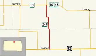 South Dakota Highway 247 (SD 247) is a short state highway running from Roscoe to an intersection with SD 10 and SD 45 east of Eureka. The route is just more than 23 miles in length.[1]