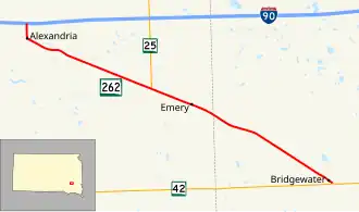 SD 262 begins at a diamond interchange with I-90 in rural Hanson County and heads south. The road almost immediately enters the city of Alexandria and takes the name of Spruce Street. In Alexandria, the route curves to the southeast and parallels a railroad. After this, SD 262 leaves the city and continues southeast. The highway crosses Pierre Creek just east of the city and passes through a series of curves which take the highway farther southeast. The road continues to parallel the railroad and intersects the southern terminus of SD 25 before traversing the community of Emery. East of Emery, SD 262 treks farther southeast through open plains and enters McCook County. The route travels for about six miles (9.7 km), then enters Bridgewater. Here, the highway reaches its eastern terminus at an intersection with SD 42.[2][3]