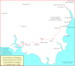 On 18th August a goods train of eleven trucks, weighing 120 long tons (122 t; 134 short tons), travelled the 8+1⁄4 miles (13.3 km), Exeter to Starcross, in 15 minutes.[note 8] On 8th September 1847, besides the usual service of trains hauled by locomotives, four extra ones commenced running, these being propelled by the atmospheric system. This was the first public use of the system on the South Devon Railway. Although the line was opened as far as Newton Abbot, between that station and Teignmouth locomotives were employed, but the piston carriage on the down train went on to Newton, where it was taken off with the superfluous carriages and placed on a convenient line to be attached to the up train when required, so that, on arriving at Teignmouth, where the locomotive was removed, the piston carriage started the train when the signal was given.[14]