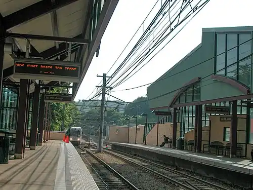 South Hills Junction station is a station on Pittsburgh Regional Transit's light rail network.[3] This station served as the original "merge point" of the inbound Beechview and Overbrook branches of the light rail system, just before the run under Mount Washington through the Mount Washington Transit Tunnel and into downtown Pittsburgh. In 1993 the Overbrook (Blue) Line was shut down for complete reconstruction to serve the modern-day light rail cars.[4] During construction, it was found that a segment of track between the Boggs Ave. stop and South Hills Junction was too narrow for the larger vehicles; this was bypassed with two wide-curved rail ramps built between the Beechview (Red) Line's Palm Garden stop and South Hills Junction where the two branches now merge.