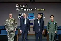 South Korea has a long military alliance with the United States, aiding the U.S. in every war since the Vietnam War, including the Iraq War.[1] At the 2009 G20 London summit, then-U.S. President Barack Obama called South Korea "one of America's closest allies and greatest friends."[2] In 1987, South Korea was among the first batch of countries to be designated as a major non-NATO ally.[3][4] In June 2023, South Korean President Yoon Suk Yeol said that he had upgraded the country's alliance with the United States to one that is "nuclear-based" in the face of North Korea's growing military threat.[5]