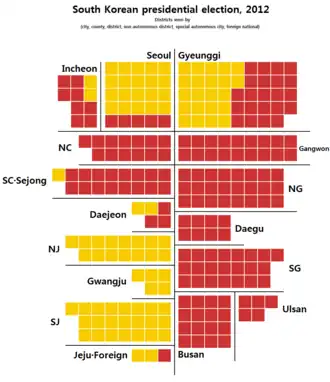 Park Geun-hye of the Saenuri party was elected the first female South Korean president with 51.6% of the vote opposed to 48.0% for her opponent Moon Jae-in.[1] Park's share of the vote was the highest won by any candidate since the beginning of free and fair direct elections in 1987 and the first such election in which any candidate won a majority.[2] Moreover, as of the 2025 election, this is the latest South Korean presidential election in which the winning candidate won an absolute majority of the vote.