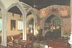 In 1871–72 the architect Ewan Christian restored the chancel and C. C. Rolfe began restoring the nave. Rolfe's cousin H. W. Moore completed the nave restoration in 1887–88.[7] During the restoration extensive 15th century wall paintings were discovered.[6] They include a Doom painting over the chancel arch,[8][9] the seven deadly sins,[10] Saint Michael weighing souls,[11] the Virgin Mary (originally part of an Annunciation scene)[6] and a rare painting of Saint Clement.[12] Burlison and Grylls heavily restored the paintings, re-drawing the weighing of souls at twice its original size.[6] St. James' tower has a ring of eight bells, all of which were cast by Mears & Stainbank of the Whitechapel Bell Foundry in 1907.[13] The church also has a Sanctus bell cast by an unknown founder in about 1399.[13]