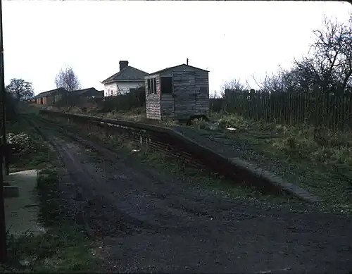 The station remained much in the same appearance until its closure.[13] It was thereafter converted into an attractive dwelling complete with central heating, mains water and electricity.[17] It was sold for £8,000 in February 1975 and planning permission was granted for the demolition of the station and the construction of a new bungalow over the trackbed.[18][19] Although a large section of the embankment near the station has been removed by farmers, it is possible to reach the site via a public footpath which runs parallel to the former line.[17] The station house still remains and is now named "Old Crossing".[11] In 1992, the old food store building, long since out-of-use, was still standing.[19]