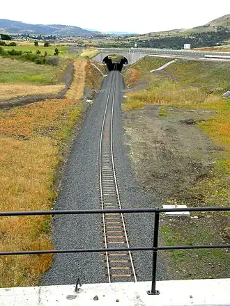 The line commences at the former Hobart intermodal Terminal at Macquarie Point, on Hobart's waterfront. The line follows the western side of the River Derwent to Bridgewater, where the river is crossed by the former Bridgewater Bridge and Causeway. From here the line runs generally north east through easy country to Rekuna (between Tea Tree and Campania). From here the often steep and/or twisty climb commences, with little respite for train crews until Rhyndaston and its 955m long tunnel is passed, some 28 km later. The descent from near Parattah is not as steep or severe as its southern counterpart, although does still include a number of difficult sections including the Tin Dish and Nala deviations which were constructed in the 1930s to lessen gradients, although at the expense of more additional curvature in some sections. North of Antill Ponds, the line roughly parallels the Midland Highway as they both follow the agriculturally rich valley's formed by the Macquarie and South Esk rivers. The South Line finishes at Western Junction near Evandale, where it connects with the Western Line.[1]