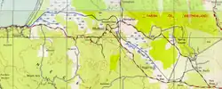 From Retreat the river arcs clockwise to flow north west out of the sugar cane into an area of swampy ground.[2] After a further 3.2 kilometres (2.0 mi)[1] it enters a region of small low hills, flowing through a defile in the middle of these for another 1 kilometre (0.62 mi)[1] before emerging to pass under a bridge carrying the Springfield - Sheffield road.[2]