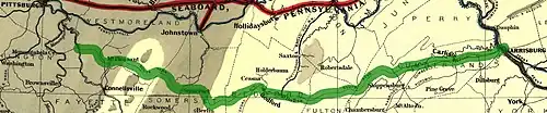 The first South Pennsylvania Railroad was originally chartered as the Duncannon, Landisburg, and Broad Top Railroad Company on May 5, 1854.[1] Its intended route began in Duncannon, passed through Landisburg and Burnt Cabins and ended on the Juniata River via the Broad Top Mountain coalfields. On May 5, 1855, it was renamed the Sherman's Valley and Broad Top Railroad Company, and the planned eastern terminus was changed from Duncannon to the mouth of Fishing Creek, in Perry County near Marysville, in order to connect with the Pennsylvania Railroad.[1] Another amendment to the charter on May 12, 1857, allowed it to connect with the Allegheny Portage Railroad and the Pittsburgh and Connellsville Railroad.[1] Around this time, two miles of the proposed route were in fact graded. On March 31, 1859, it was given the grandiose name of Pennsylvania Pacific Railway Company, with the rights to extend into Maryland and Virginia.[1] On April 1, 1863, it was renamed as the South Pennsylvania Railroad Company.[1] Despite feverish promotion, including plans for 200 miles (322 km) of line from Marysville to West Newton (on the Youghiogheny River), no further work was completed. The two miles (3 km) of grading were sold off in 1872 and the charter became dormant on May 31, 1879.