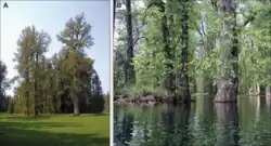 A small grove of quaking aspen exists at the edge of the coniferous forested area that is annually inundated. Large-diameter black cottonwoods are found within the meadow itself; these cottonwoods stand in the middle of the lake when the meadow is flooded.[4]