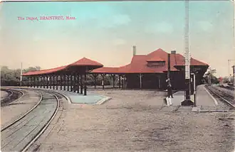 The 11.5 mile line opened for service from Braintree to Cohasset, on January 1, 1849. However, the 17.5 mile portion between Cohasset and Duxbury, Massachusetts, was not built until 1871 when a new company, the Duxbury and Cohasset Railroad completed the line to South Duxbury and Kingston where it connected to the old 1844 Old Colony Railroad line to Plymouth.[1] One of the early promoters and presidents of the South Shore Railroad was Caleb Stetson, a successful shoe manufacturer from Braintree.[2]