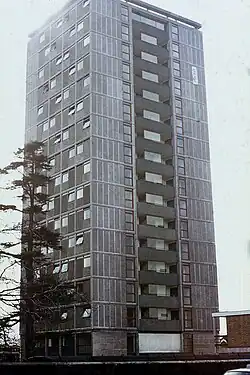 The stables and servants' quarters were demolished in 1961[5] and in 1964 a concrete tower extension was added to the hall, incorporating a bar and dining hall area. The tower contained 180 student rooms over its 17 floors and was 48.7 metres high,[23] making it the 10th-tallest building in Southampton in December 2017.[24] Despite some later claims to the contrary,[20] there is no contemporary evidence that these extensions were intended to be temporary.