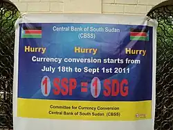 It was introduced on 18 July 2011, and replaced the Sudanese pound at par.[5] On 1 September 2011, the Sudanese pound ceased to be legal tender in South Sudan.