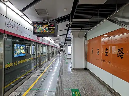 South Wenhai Road (Chinese: 文海南路) is a station on Line 1 and Line 8 of the Hangzhou Metro in China.[1] It was opened on 24 November 2015, together with the expanded section of Line 1.[2] The Line 8 was opened on 28 June 2021.[3] It is located in the Qiantang District of Hangzhou.