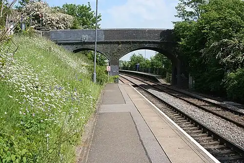 South Wigston station's two platforms are staggered, one each side of a wide footbridge over the railway.[2]