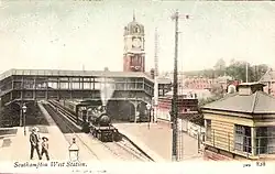 Southampton Central station was opened as Southampton West in 1895, to replace the smaller nearby West End station; this was originally named Blechynden when it opened in 1847.[3] The station was on the seafront, specifically the stretch of water known as West Bay, with the water reaching right up to the southern edge of the platforms at high tide. A series of land reclamation projects to expand the docks, largely funded by the London and South Western Railway, culminated in the building of the vast New Docks (now Western Docks) between 1927 and 1934, which led to all of West Bay being reclaimed and the station becoming landlocked. The new land and the demand for new lines allowed the station to be enlarged and redeveloped in 1934–1935 (from two platforms to four) and it became Southampton Central.[4] The new station buildings were largely constructed from concrete in the art deco style.[5]