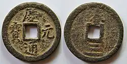 The Southern Song dynasty saw the emergence of paper money, while coins were increasingly becoming a rarity.[4] Iron cash coins also started to be used in greater numbers, at first due to the lack of copper, but later even as more copper was found the production of iron cash coins remained cheaper and an abundance of iron made it more attractive for the government to produce, while several problems such as the fact that iron is harder to inscribe, and that iron corrodes faster ensured the continued production of copper cash coins.[5] Despite the chronic shortages of copper the Southern Song used special coins as a form of psychological warfare against Jin army defectors,[6] and copper coins (and later silver sycees) would remain the standard of administration even for the newly introduced paper money.[7]