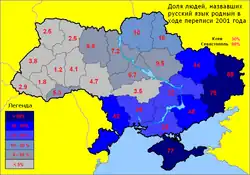 Russian is spoken by a significant minority in the region, although not to the extent that it is in the three oblasts that comprise eastern Ukraine.[4] Effective in August 2012, a new law on regional languages entitles any local language spoken by at least a 10% minority be declared official within that area.[5] Within weeks Russian was declared as a regional language in several southern and eastern oblasts and cities.[6] Russian could then be used in these cities/oblasts' administrative office work and documents.[7] On 23 February 2014, the Ukrainian parliament voted to repeal the law on regional languages, which would have made Ukrainian the sole state language at all levels even in southern and eastern Ukraine.[8] This vote was vetoed by acting President Turchynov on March 2.[9][10] Nevertheless the law was repealed by the Constitutional Court of Ukraine on 28 February 2018 when it ruled the law unconstitutional.[11]