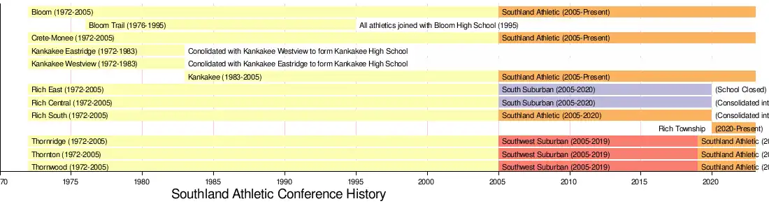 In 2019–20, Thornridge, Thornton, and Thornwood left the Southwest Suburban Conference to join the Southland Conference. In 2020, Rich East High School closes while Rich South and Rich Central consolidate into Rich Township High School