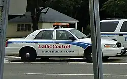 As of 2017, the Southold Police Department's patrol vehicles use a two-tone navy blue and white body. The department's patch is emblazoned on each front door with the words "POLICE" and "TOWN OF SOUTHOLD" spanning both doors of the vehicle. The words "DIAL 911 EMERGENCY" are printed on each rear side panel above the gas intake. Patrol supervisors use an all-white body with the same design as regular patrol vehicles. Traffic control vehicles use the department's older color scheme: an all-white body with two blue stripes arching from the rear tail lights to the front wheels. The words "TRAFFIC CONTROL" are printed in red on the vehicle's door above a blue "SOUTHOLD TOWN" inscription.
