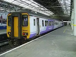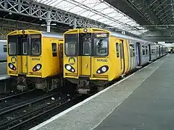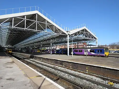Southport railway station serves the town of Southport, Merseyside, England. The station is the terminal of the electricified Southport branch of the Northern Line of the electric Merseyrail network and the diesel-operated Manchester-Southport Line. It is the fourth busiest station on the Merseyrail network.[1] The station and services to Liverpool Central are operated by Merseyrail, with Manchester services operated by Northern Trains.