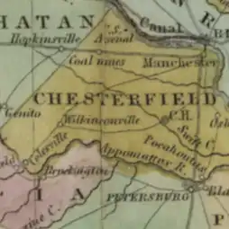 The city of Manchester rose to prominence through its 1831 Chesterfield Railroad and its 1853 successor the Richmond and Danville Railroad.