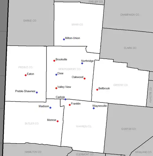 - Dixie, Milton-Union, Northridge, and Preble-Shawnee left the conference in 2021 narrowing down the conference to 10 teams. Valley View, Eaton and Brookville moved to the Buckeye Division and Waynesville moved to the Southwestern Division