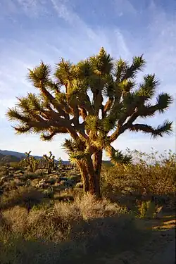 The most northwest portion of the American Southwest is covered by the Mojave Desert. Bordered on the south by the Sonoran Desert and the east by the Colorado Plateau, its range within the region makes up the southeast tip of Nevada, the southwestern corner of Utah and the northwestern corner of Arizona.[24] In terms of topography, the Mojave is very similar to the Great Basin Desert, which lies just to its north.[20] Within the region, Las Vegas is the most populous city; other significant population centers include Laughlin and Pahrump in Nevada, St. George and Hurricane in Utah, and Lake Havasu City, Kingman, and Bullhead City in Arizona. The Mojave is the smallest, driest and hottest desert within the United States.[24] The Mojave gets less than 6 in (150 mm) of rain annually, and its elevation ranges from 3,000 to 6,000 feet (900 to 1,800 meters) above sea level.[26] The most prolific vegetation is the tall Joshua tree, which grow as tall as 40 ft (12 m), and are thought to live almost 1000 years.[24] Other major vegetation includes the Parry saltbush and the Mojave sage, both only found in the Mojave, as well as the creosote bush.[27]