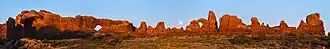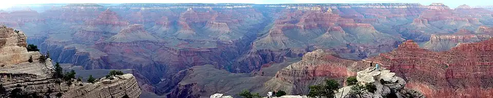The Colorado Plateau varies from the large stands of forests in the west, including the largest stand of ponderosa pine trees in the world, to the Mesas to the east.[28] The Colorado Plateau consists mostly of high desert. Within the Southwest U.S. region, the Colorado is bordered to the south by the Mogollon Rim and the Sonoran Desert, to the west by the Mojave Desert, and to the east by the Rocky Mountains, the Rio Grande Rift valley, and the Llano Estacado.[24] The Plateau is characterized by a series of plateaus and mesas, interspersed with canyons.[24] The most dramatic example is the Grand Canyon.[29] But that is one of many dramatic vistas included within the Plateau, which includes spectacular lava formations, "painted" deserts, sand dunes, and badlands.[30] One of the most distinctive features of the Plateau is its longevity, having come into existence at least 500 million years ago.[31] The Plateau can be divided into six sections, three of which fall into the Southwest region. Beginning with the Navajo section forming the northern boundary of the Southwestern United States, which has shallower canyons than those in the Canyonlands section just to its north; the Navajo section is bordered to the south by the Grand Canyon section, which of course is dominated by the Grand Canyon; and the southeasternmost portion of the Plateau is the Datil section, consisting of valleys, mesas, and volcanic formations.[32] Albuquerque is the most populous city often considered at the edge of this portion contained in the Southwest region, but Santa Fe, New Mexico and Flagstaff, Arizona, are also significant population centers.