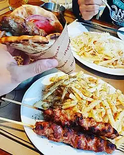 Souvlaki (Greek: σουβλάκι, souvláki, [suˈvlaki]; plural: σουβλάκια, souvlákia) is a Greek food item consisting of small pieces of meat and sometimes vegetables grilled on a skewer. It is usually eaten straight off the skewer while still hot. It can be served with or inside a rolled pita, typically with lemon, sauces, vegetables such as sliced tomato and onion, and fried potatoes as a side. The meat usually used in Greece and Cyprus is pork.[1]