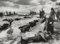 At the outbreak of World War II, many Soviet photographers became war correspondents, incorporating the photographic invention of the revolutionary avant-garde in documenting the lives and deaths of Soviet troops, conflict, destruction and German atrocities. Sovfoto coverage of the Red Army's advance produced by Russian photographers turned war correspondents arrived at Associated Press offices in New York by radio from Moscow as early as August 1944. These were the first evidence of the Holocaust; one showing residents of Lublin surrounding a pit filled with bodies of those killed by the Germans who occupied the city; another, according to the Sovfoto caption accompanying it, showed: "The Lublin camp of annihilation. In their well-built cremation ovens, the Hitlerites daily burnt the bodies of those whom they tortured to death in the camp."[24] During the Korean War, Eastfoto images of American POW's distributed by Sovfoto led to the identification of at least two of the US combatants pictured.[25]