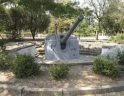 During an attack by German aircraft on 12 November, the destroyer was struck by two bombs during a raid by Heinkel He 111s of the First Group of Kampfgeschwader 27 (I./KG 27) and Junkers Ju 88s of KG 51.[11] The bombs broke Sovershenny's back, already weakened by the mine explosion, and started extensive fires fueled by remaining oil in her tanks, which burned out her stern. They also damaged the drydock so that it flooded and the water gave the ship a 25° list. Two days later, she was struck by a pair of 150 mm (5.9 in) artillery shells. Sovershenny was disarmed in early December and her main guns were used to form a coastal artillery battery,[12] positioned on Malakhov kurgan and manned by 65 of her sailors.[13] The drydock was repaired and drained on 20 February 1942, after which repairs resumed, which reconstructed her hull in two months. Sovershenny was removed from drydock in early May and moored in Korabelnaya bay for completion, but in early June she was damaged by several near misses from bombs and another landed in a boiler room. The explosion of a German heavy artillery shell near a starboard boiler room on 15 June holed the ship, causing flooding that tugboats failed to pump out, and Sovershenny sank with only her forward superstructure unsubmerged.[3][Note 1] After the end of the war, her wreck was refloated by an emergency rescue detachment of the Black Sea Fleet on 28 October 1945; she was deemed irreparable and struck from the Soviet Navy on 27 December of that year, being sent to the Sevastopol Glavvtorchermet base at Inkerman for scrapping.[15][16]