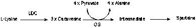 More recent enzymatic evidence has indicated the presence of 17-oxosparteine synthase (OS), a transaminase enzyme.[6][7][8][9][10][11] The deaminated cadaverine is not released from the enzyme, thus is can be assumed that the enzyme catalyzes the formation of the quinolizidine skeleton in a channeled fashion .[9][10][11] 7-oxosparteine requires four units of pyruvate as the NH2 acceptors and produces four molecules of alanine. Both lysine decarboxylase and the quinolizidine skeleton-forming enzyme are localized in chloroplasts.[12]